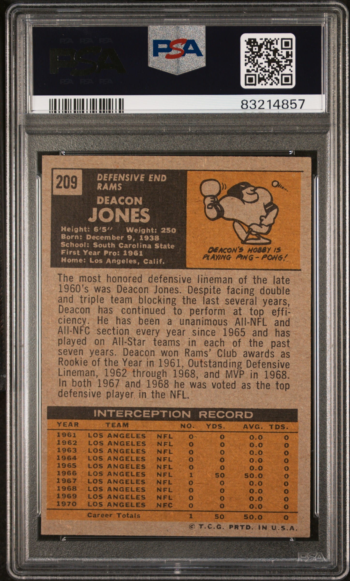 This Football card, from 1971 is part of the Topps  card set. Deacon Jones is featured and has a card number of 209. It is graded by PSA and has a numeric grade of 6.