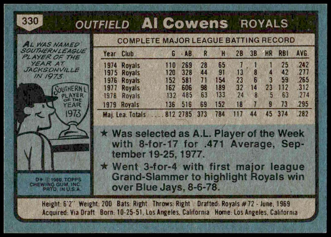 This Baseball card, from 1980 is part of the Topps  card set. Al Cowens is featured and has a card number of 330.