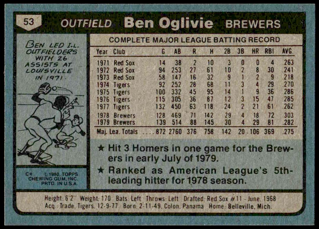 This Baseball card, from 1980 is part of the Topps  card set. Ben Oglivie is featured and has a card number of 53.