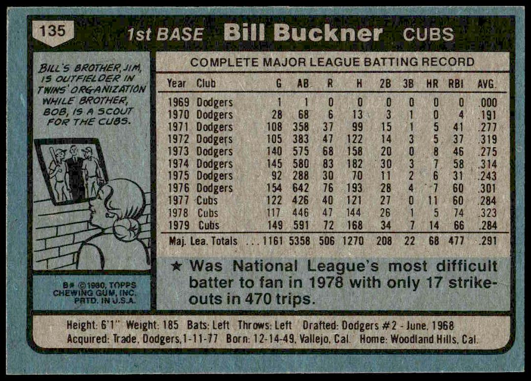 This Baseball card, from 1980 is part of the Topps  card set. Bill Buckner is featured and has a card number of 135.