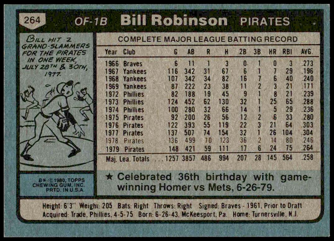 This Baseball card, from 1980 is part of the Topps  card set. Bill Robinson is featured and has a card number of 264.