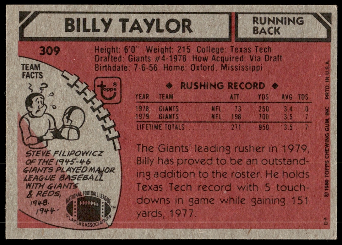 This Football card, from 1980 is part of the Topps card set. Billy Taylor is featured and has a card number of 309.