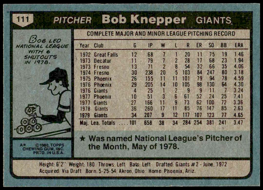 This Baseball card, from 1980 is part of the Topps  card set. Bob Knepper is featured and has a card number of 111.