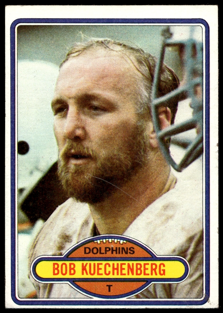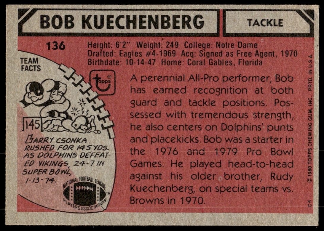 This Football card, from 1980 is part of the Topps card set. Bob Kuechenberg is featured and has a card number of 136.