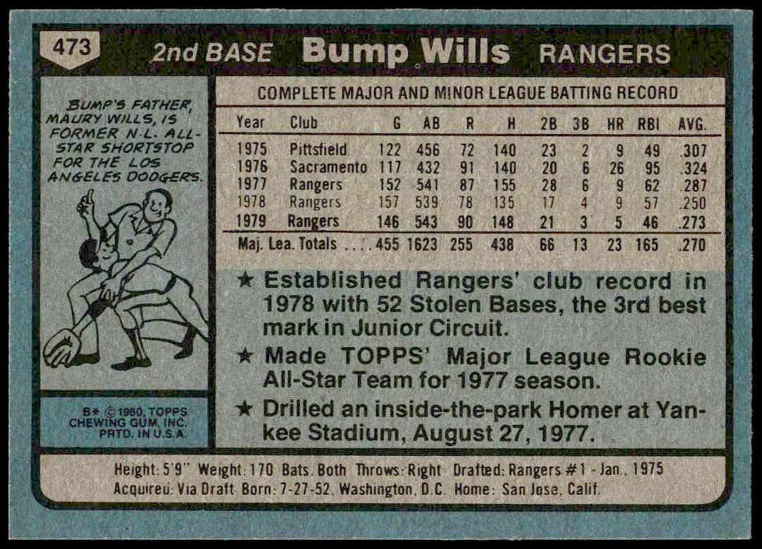 This Baseball card, from 1980 is part of the Topps  card set. Bump Wills is featured and has a card number of 473.