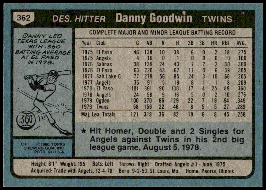 This Baseball card, from 1980 is part of the Topps  card set. Danny Goodwin is featured and has a card number of 362.