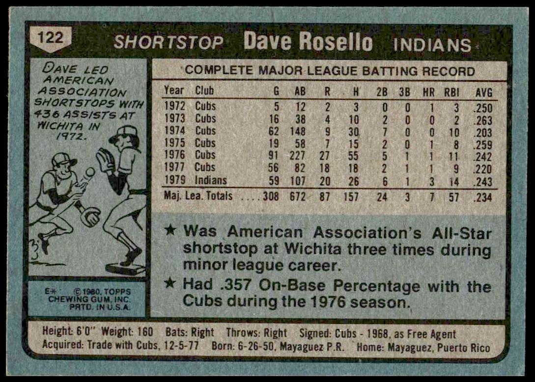 This Baseball card, from 1980 is part of the Topps  card set. Dave Rosello is featured and has a card number of 122.