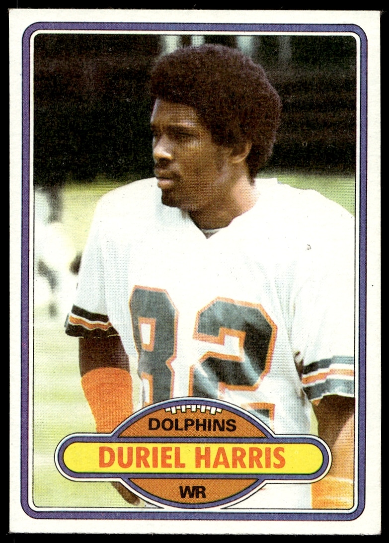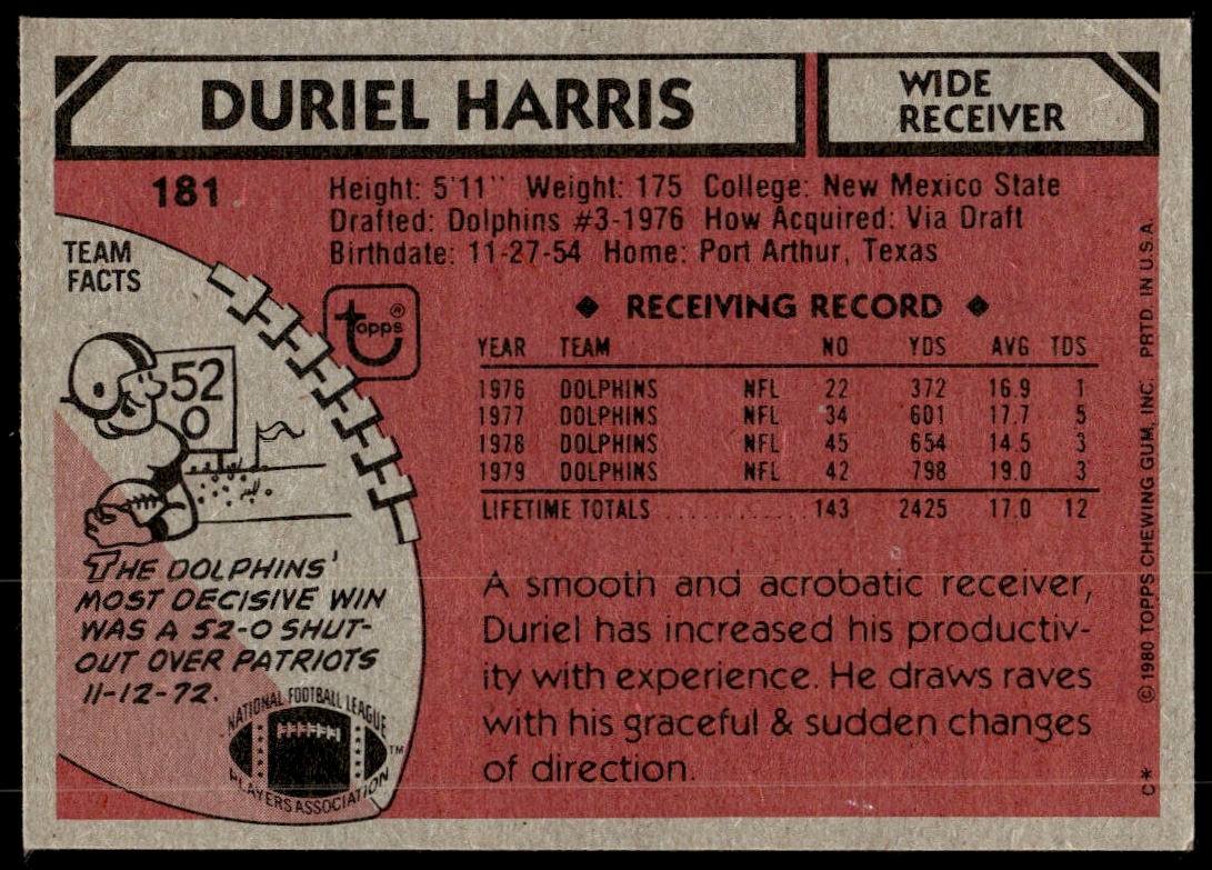 This Football card, from 1980 is part of the Topps card set. Duriel Harris is featured and has a card number of 181.