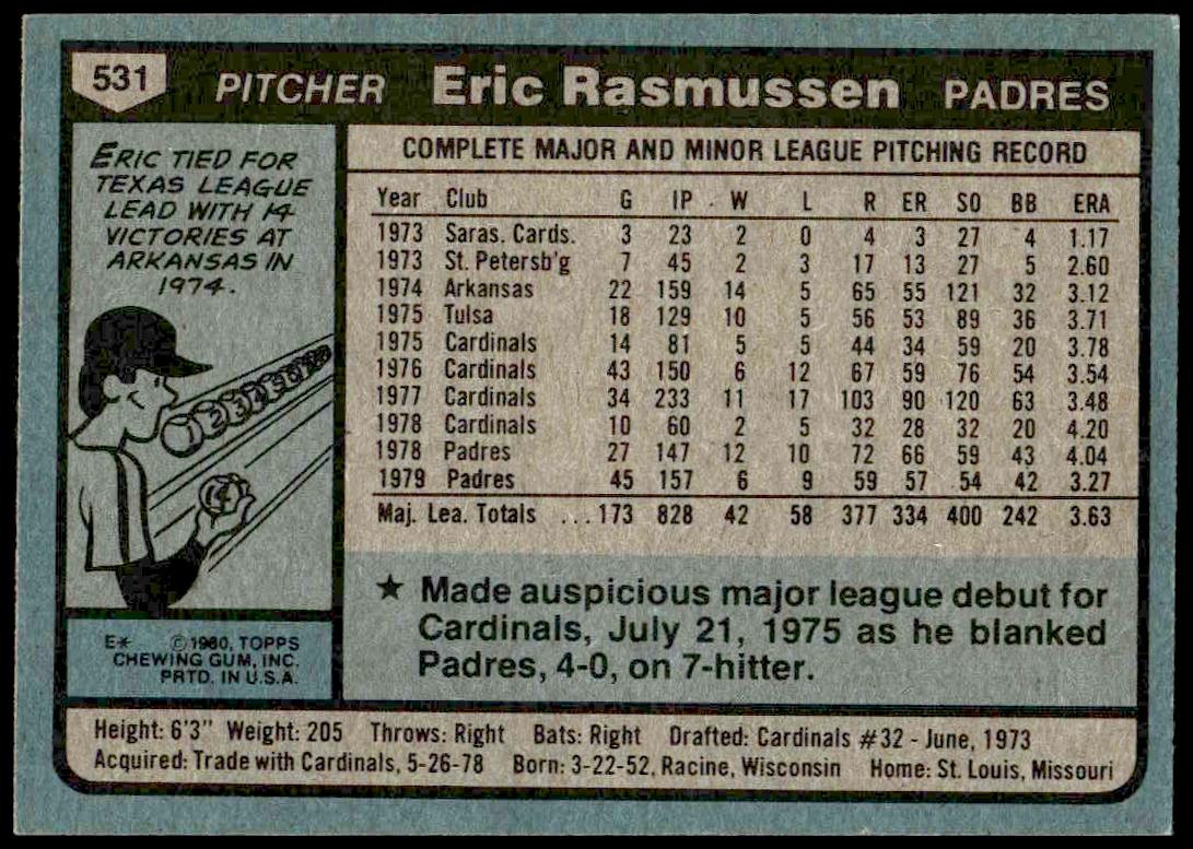 This Baseball card, from 1980 is part of the Topps  card set. Eric Rasmussen is featured and has a card number of 531.