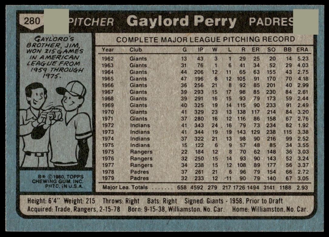 This Baseball card, from 1980 is part of the Topps  card set. Gaylord Perry is featured and has a card number of 280.