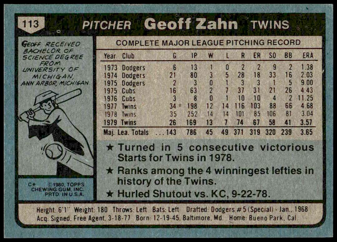This Baseball card, from 1980 is part of the Topps  card set. Geoff Zahn is featured and has a card number of 113.