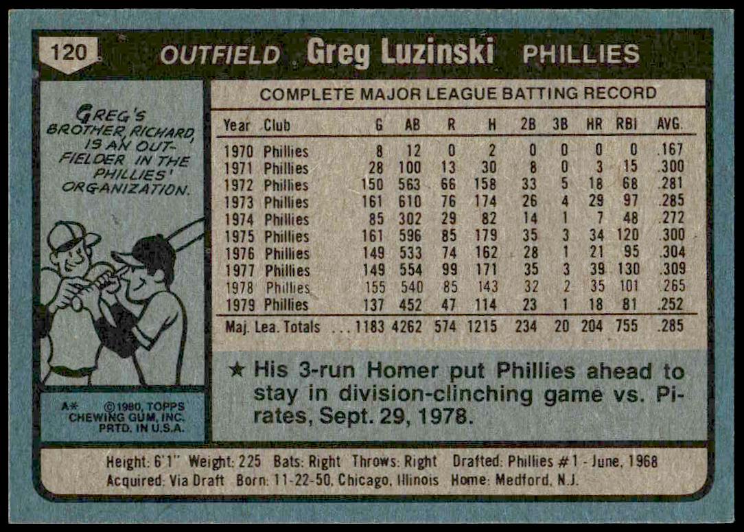 This Baseball card, from 1980 is part of the Topps  card set. Greg Luzinski is featured and has a card number of 120.