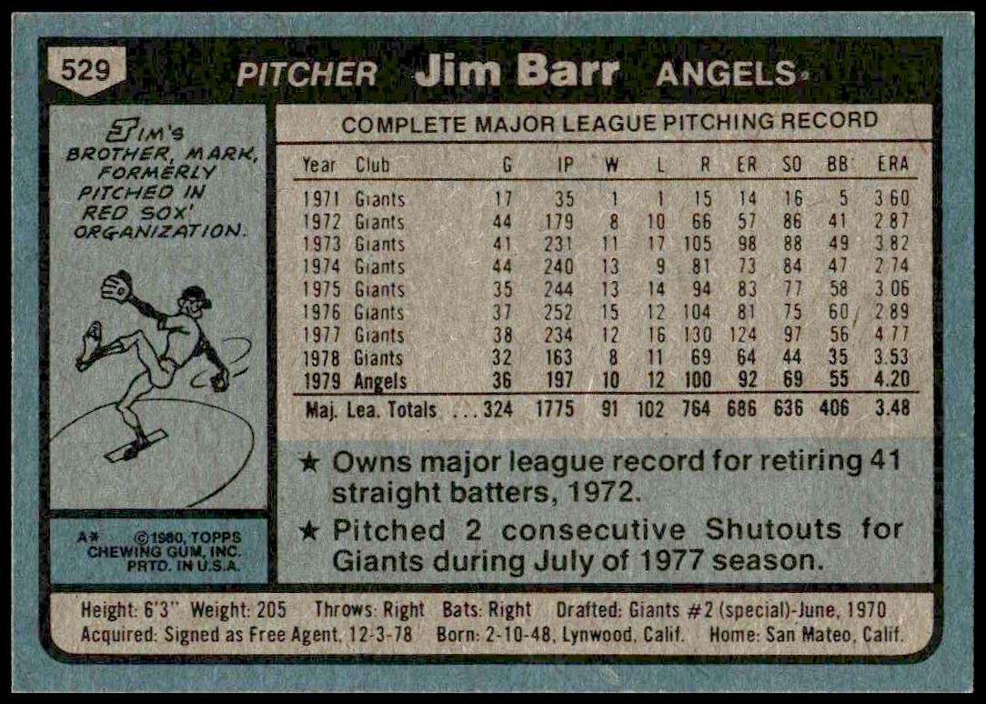 This Baseball card, from 1980 is part of the Topps  card set. Jim Barr is featured and has a card number of 529.
