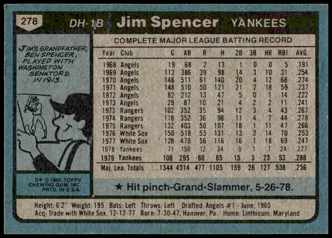 This Baseball card, from 1980 is part of the Topps  card set. Jim Spencer is featured and has a card number of 278.