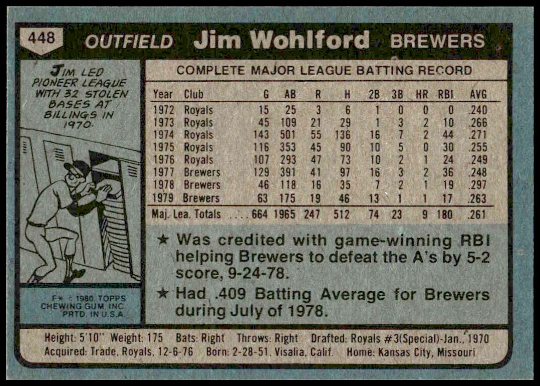 This Baseball card, from 1980 is part of the Topps  card set. Jim Wohlford is featured and has a card number of 448.