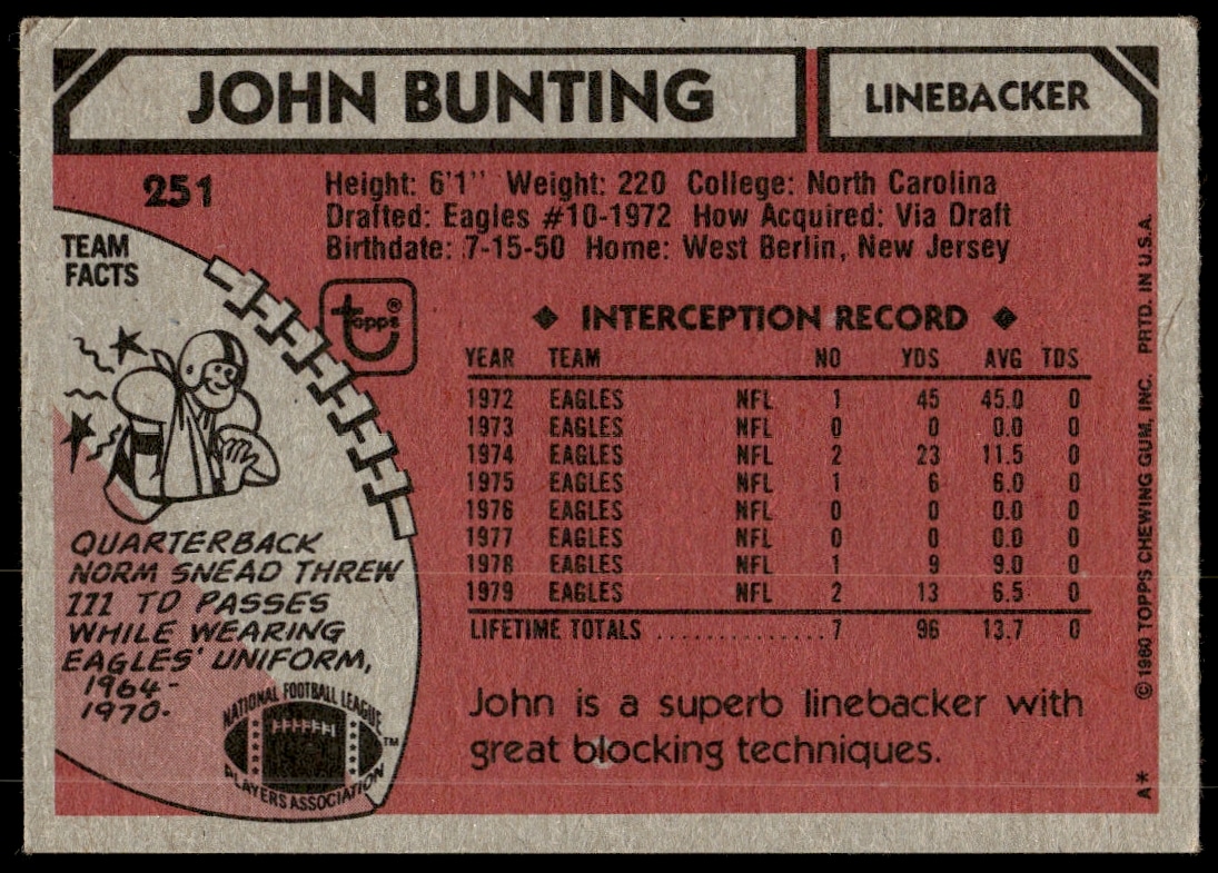 This Football card, from 1980 is part of the Topps card set. John Bunting is featured and has a card number of 251.