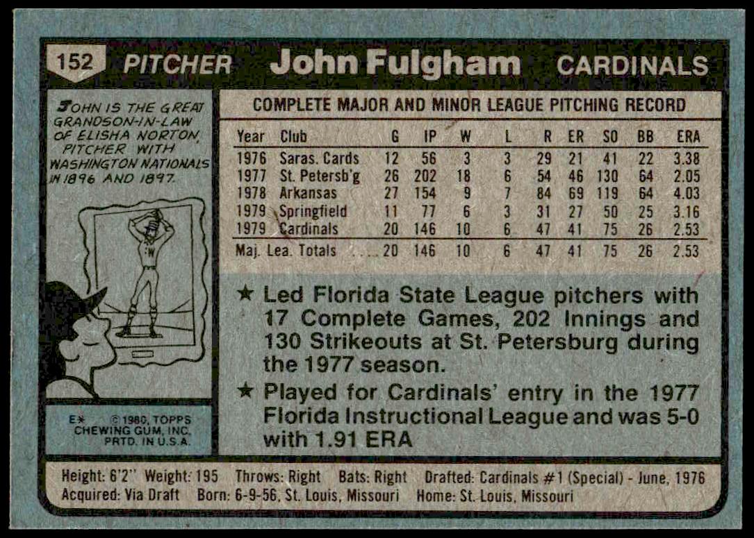 This Baseball card, from 1980 is part of the Topps  card set. John Fulgham is featured and has a card number of 152.