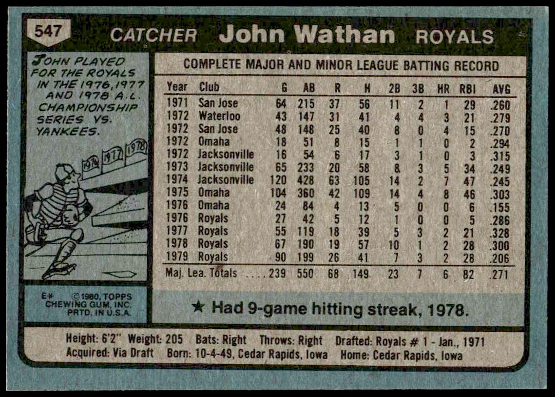 This Baseball card, from 1980 is part of the Topps  card set. John Wathan is featured and has a card number of 547.
