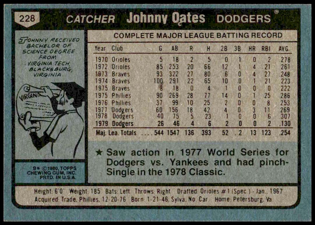 This Baseball card, from 1980 is part of the Topps  card set. Johnny Oates is featured and has a card number of 228.