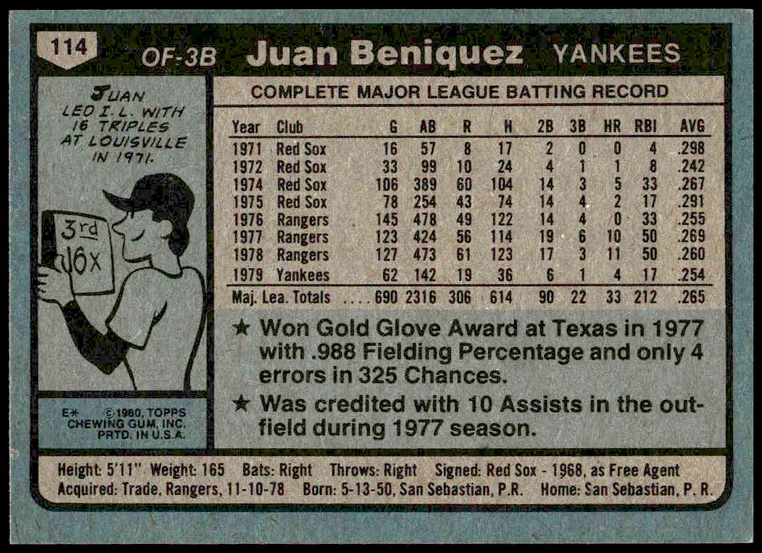 This Baseball card, from 1980 is part of the Topps  card set. Juan Beniquez is featured and has a card number of 114.