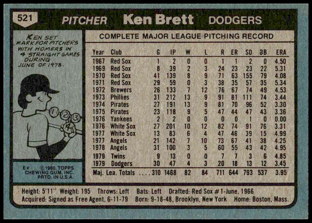 This Baseball card, from 1980 is part of the Topps  card set. Ken Brett is featured and has a card number of 521.