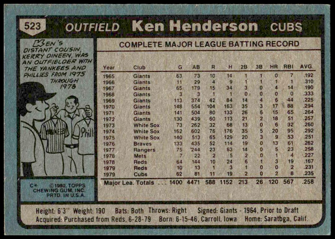 This Baseball card, from 1980 is part of the Topps  card set. Ken Henderson is featured and has a card number of 523.