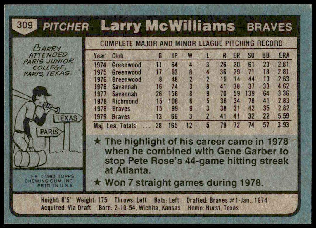 This Baseball card, from 1980 is part of the Topps  card set. Larry McWilliams is featured and has a card number of 309.