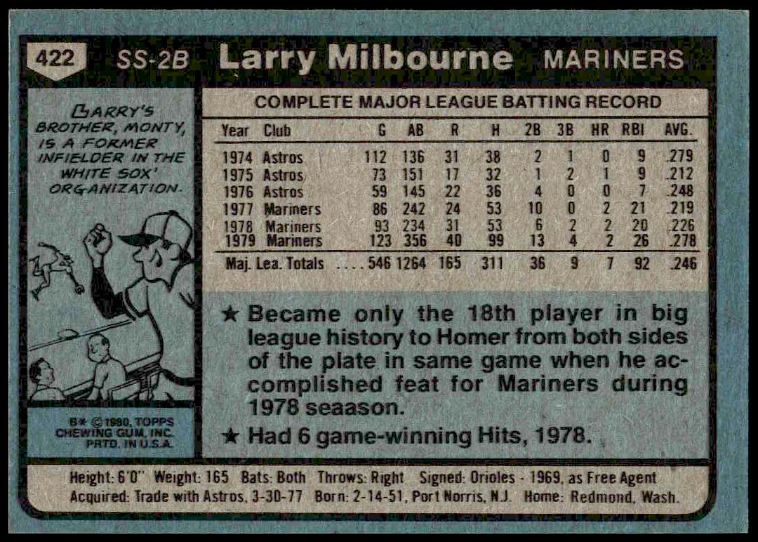 This Baseball card, from 1980 is part of the Topps  card set. Larry Milbourne is featured and has a card number of 422.