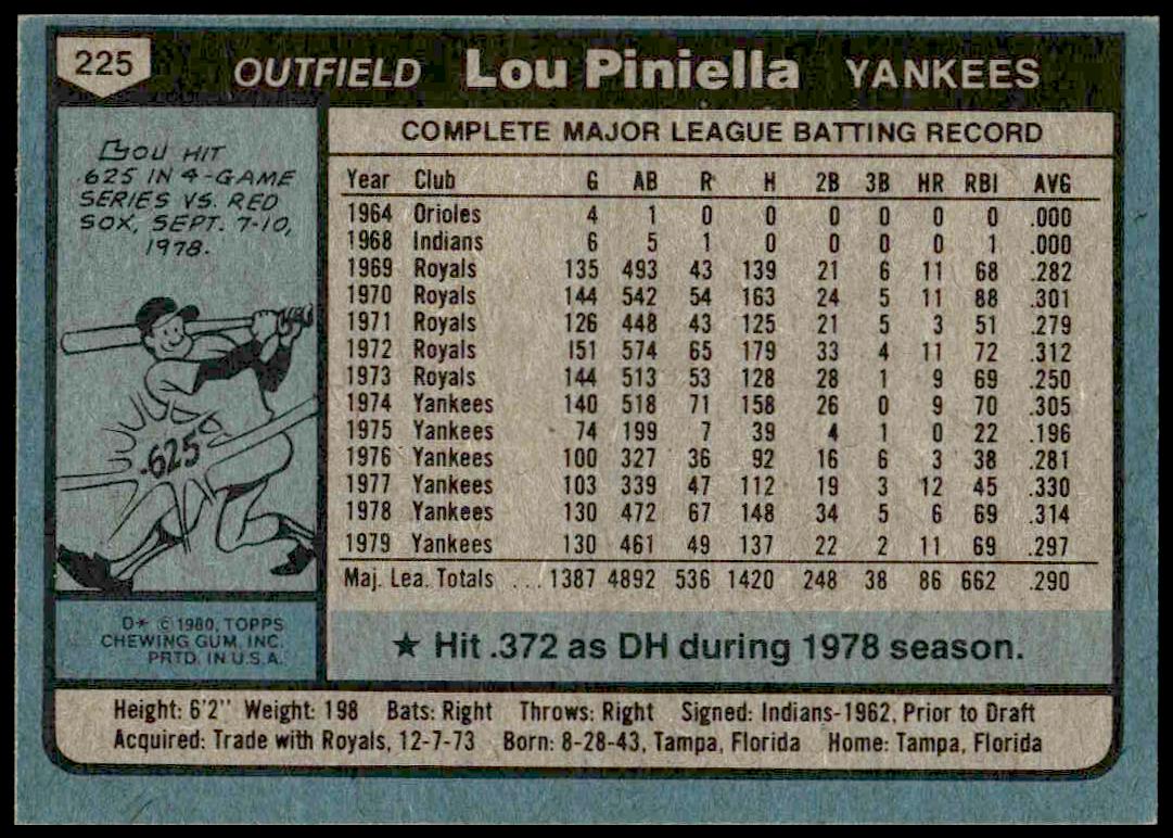 This Baseball card, from 1980 is part of the Topps  card set. Lou Piniella is featured and has a card number of 225.