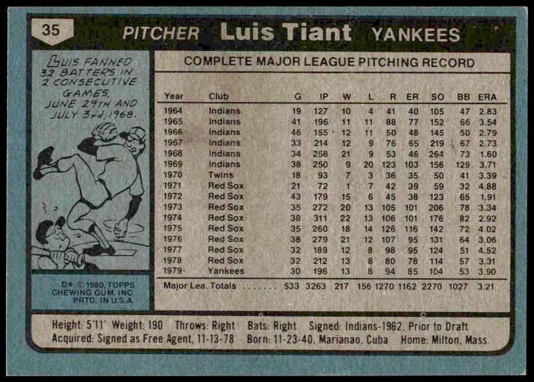 This Baseball card, from 1980 is part of the Topps  card set. Luis Tiant is featured and has a card number of 35.