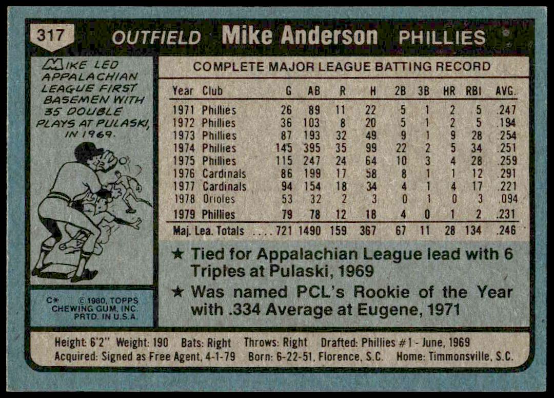 This Baseball card, from 1980 is part of the Topps  card set. Mike Anderson is featured and has a card number of 317.