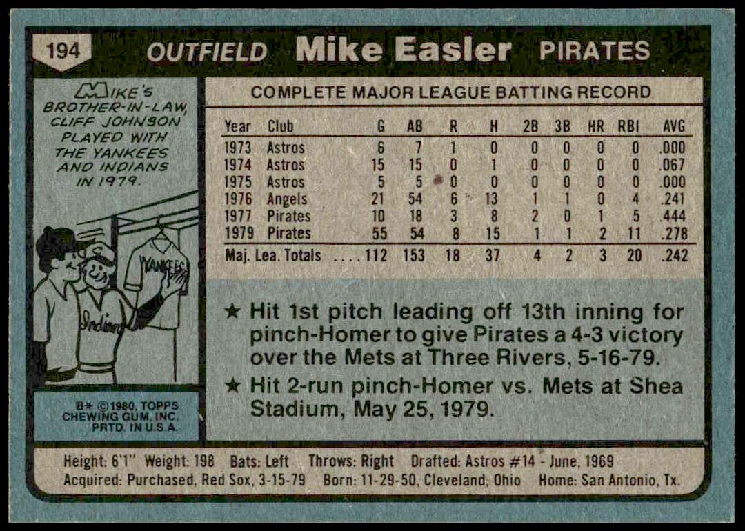 This Baseball card, from 1980 is part of the Topps  card set. Mike Easler is featured and has a card number of 194.