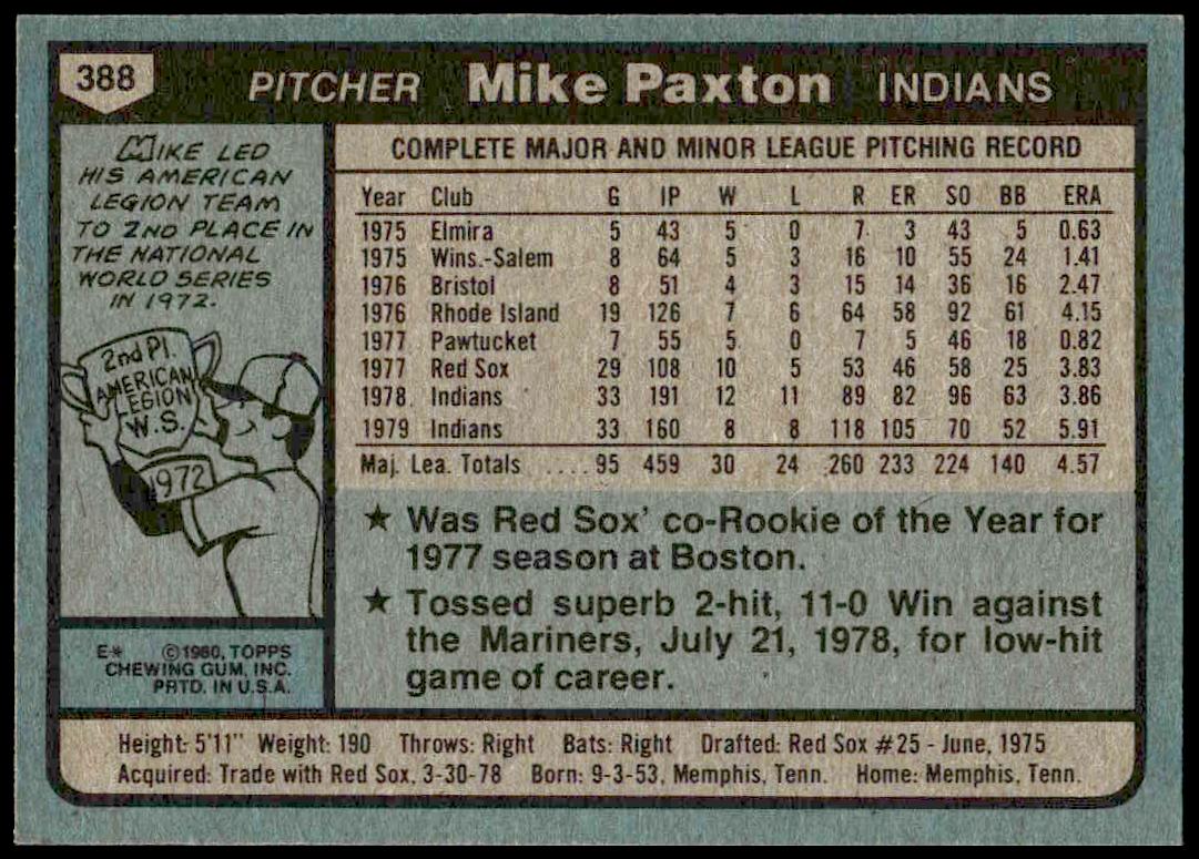 This Baseball card, from 1980 is part of the Topps  card set. Mike Paxton is featured and has a card number of 388.