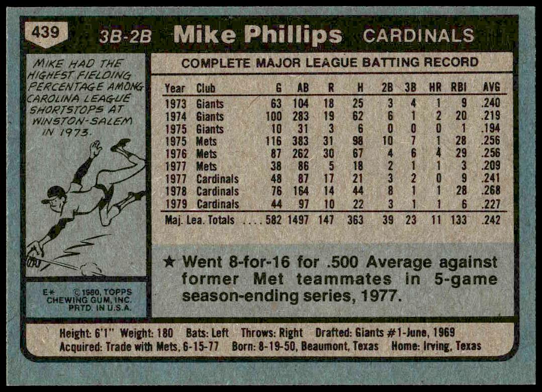 This Baseball card, from 1980 is part of the Topps  card set. Mike Phillips is featured and has a card number of 439.