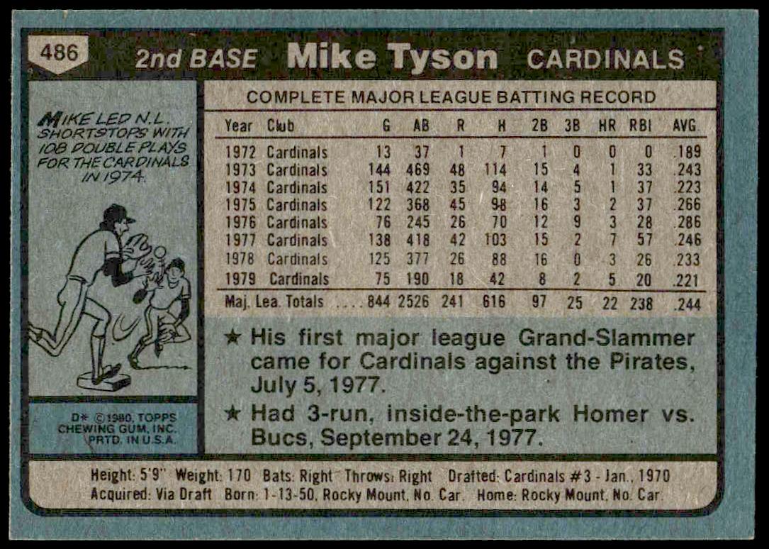 This Baseball card, from 1980 is part of the Topps  card set. Mike Tyson is featured and has a card number of 486.