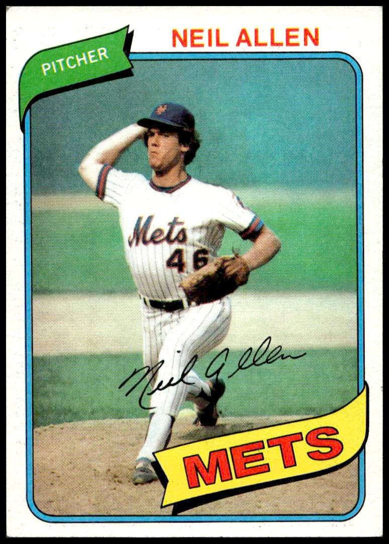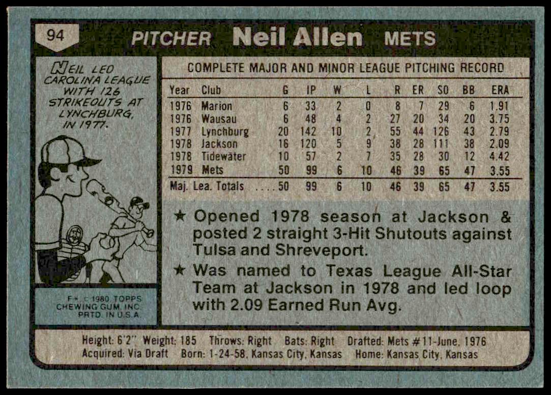 This Baseball card, from 1980 is part of the Topps  card set. Neil Allen is featured and has a card number of 94.