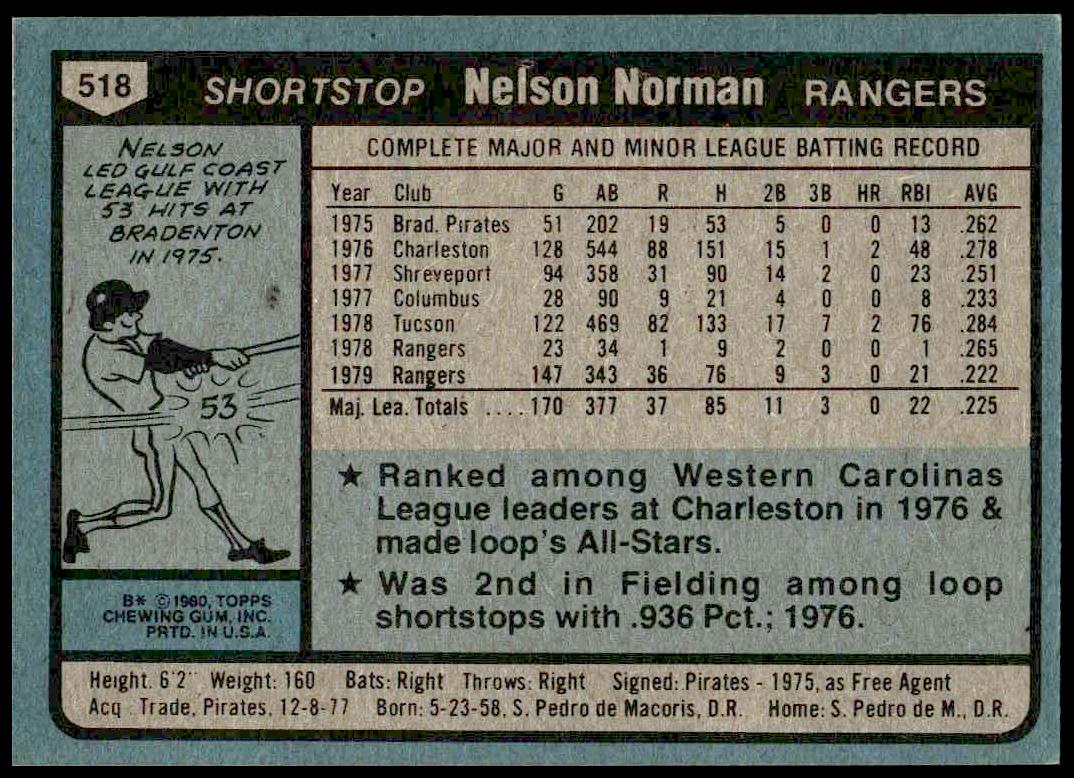 This Baseball card, from 1980 is part of the Topps  card set. Nelson Norman is featured and has a card number of 518.