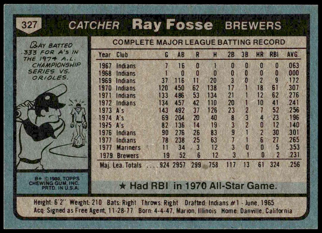 This Baseball card, from 1980 is part of the Topps  card set. Ray Fosse is featured and has a card number of 327.