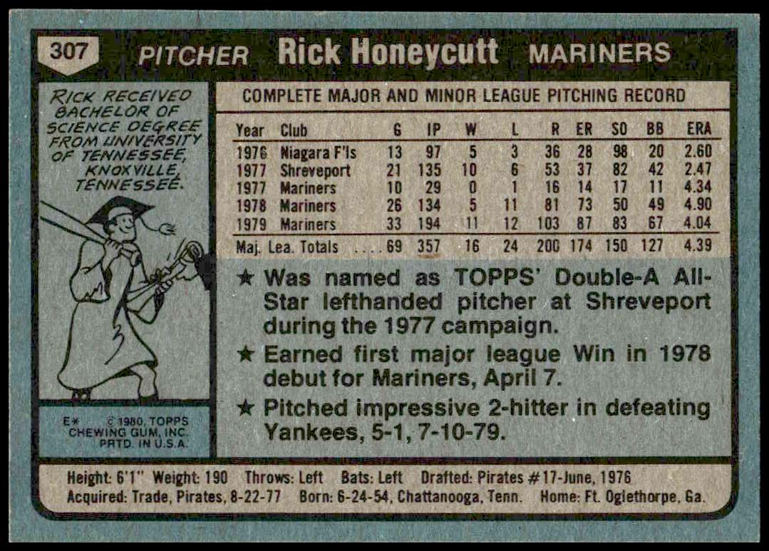 This Baseball card, from 1980 is part of the Topps  card set. Rick Honeycutt is featured and has a card number of 307.
