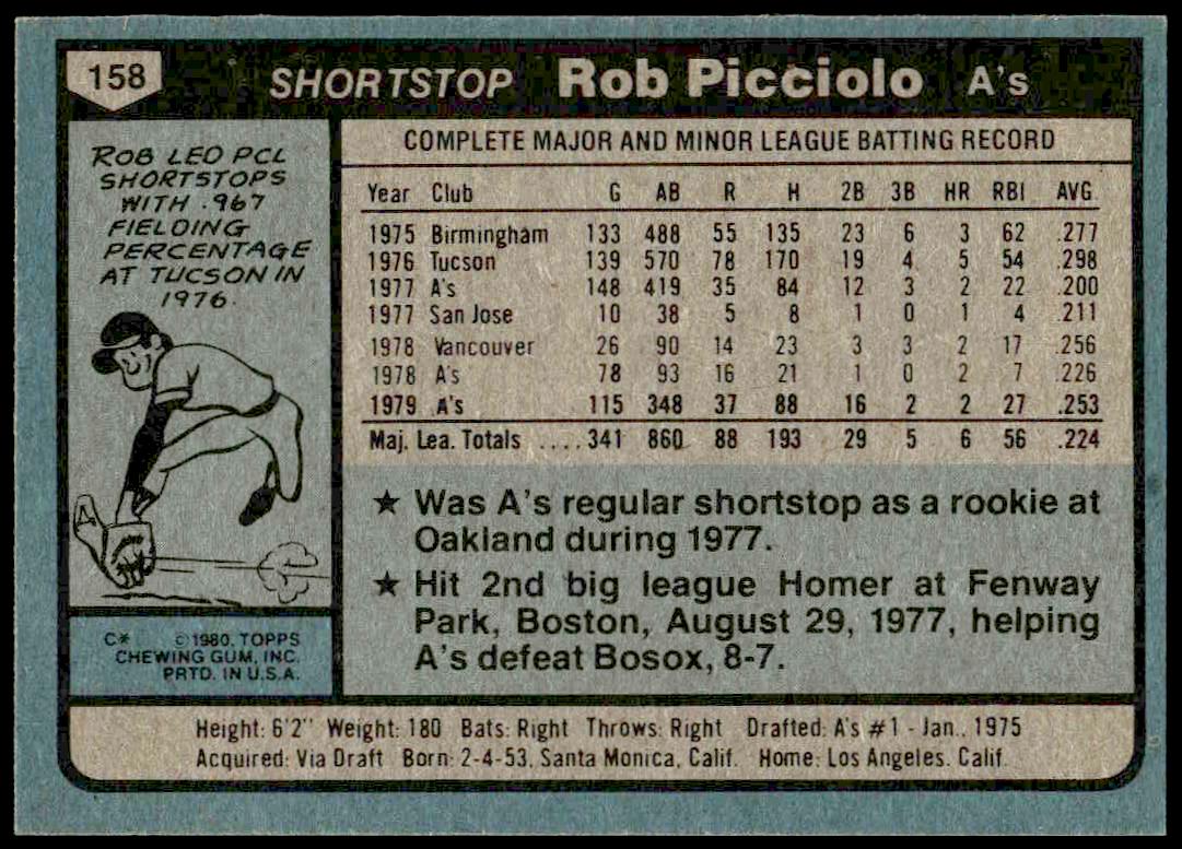 This Baseball card, from 1980 is part of the Topps  card set. Rob Picciolo is featured and has a card number of 158.