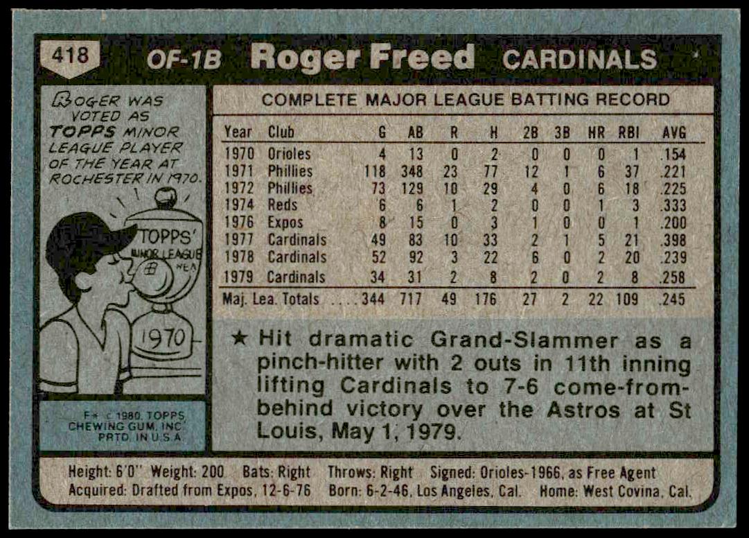 This Baseball card, from 1980 is part of the Topps  card set. Roger Freed is featured and has a card number of 418.