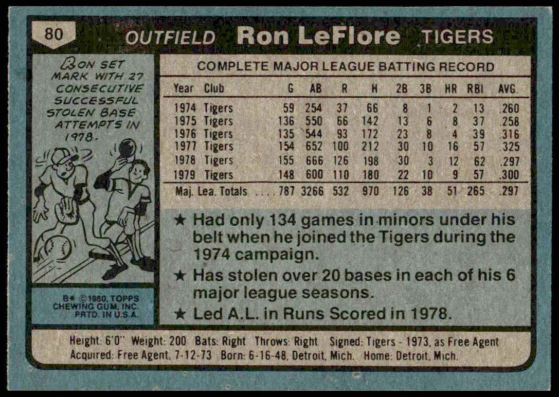 This Baseball card, from 1980 is part of the Topps  card set. Ron LeFlore is featured and has a card number of 80.
