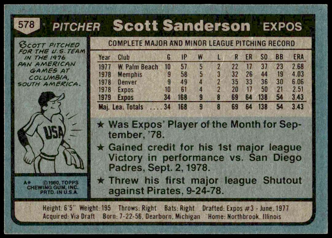 This Baseball card, from 1980 is part of the Topps  card set. Scott Sanderson is featured and has a card number of 578.
