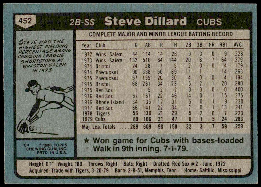 This Baseball card, from 1980 is part of the Topps  card set. Steve Dillard is featured and has a card number of 452.