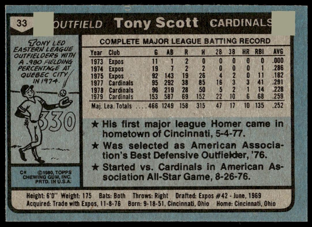 This Baseball card, from 1980 is part of the Topps  card set. Tony Scott is featured and has a card number of 33.