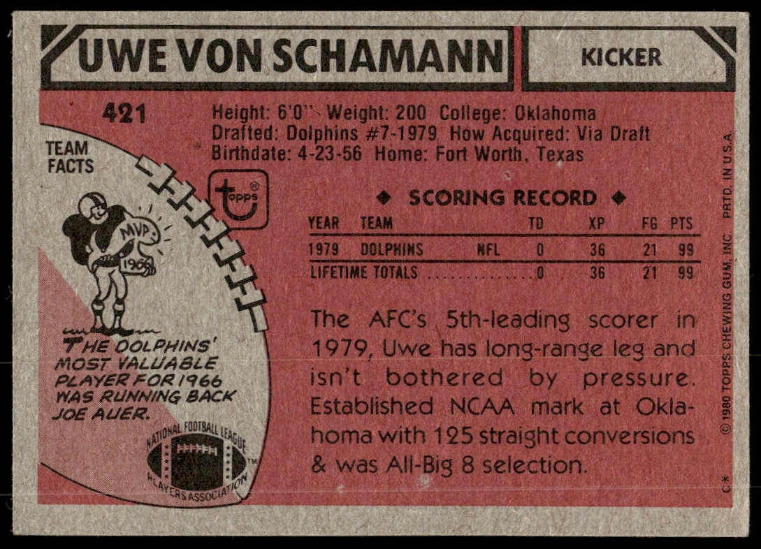 This Football card, from 1980 is part of the Topps card set. Uwe Von Schamann is featured and has a card number of 421.