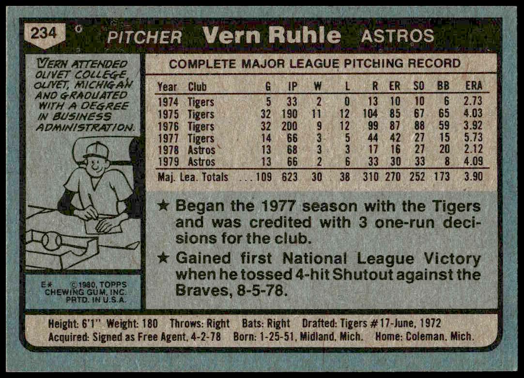 This Baseball card, from 1980 is part of the Topps  card set. Vern Ruhle is featured and has a card number of 234.