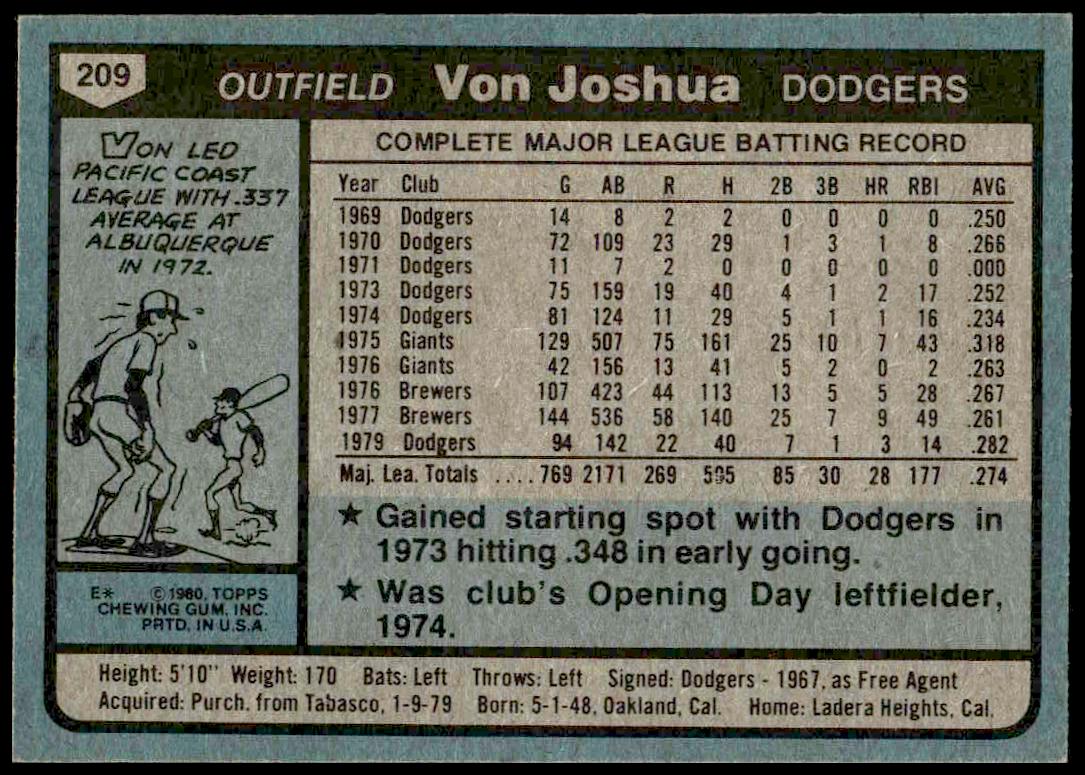 This Baseball card, from 1980 is part of the Topps  card set. Von Joshua is featured and has a card number of 209.