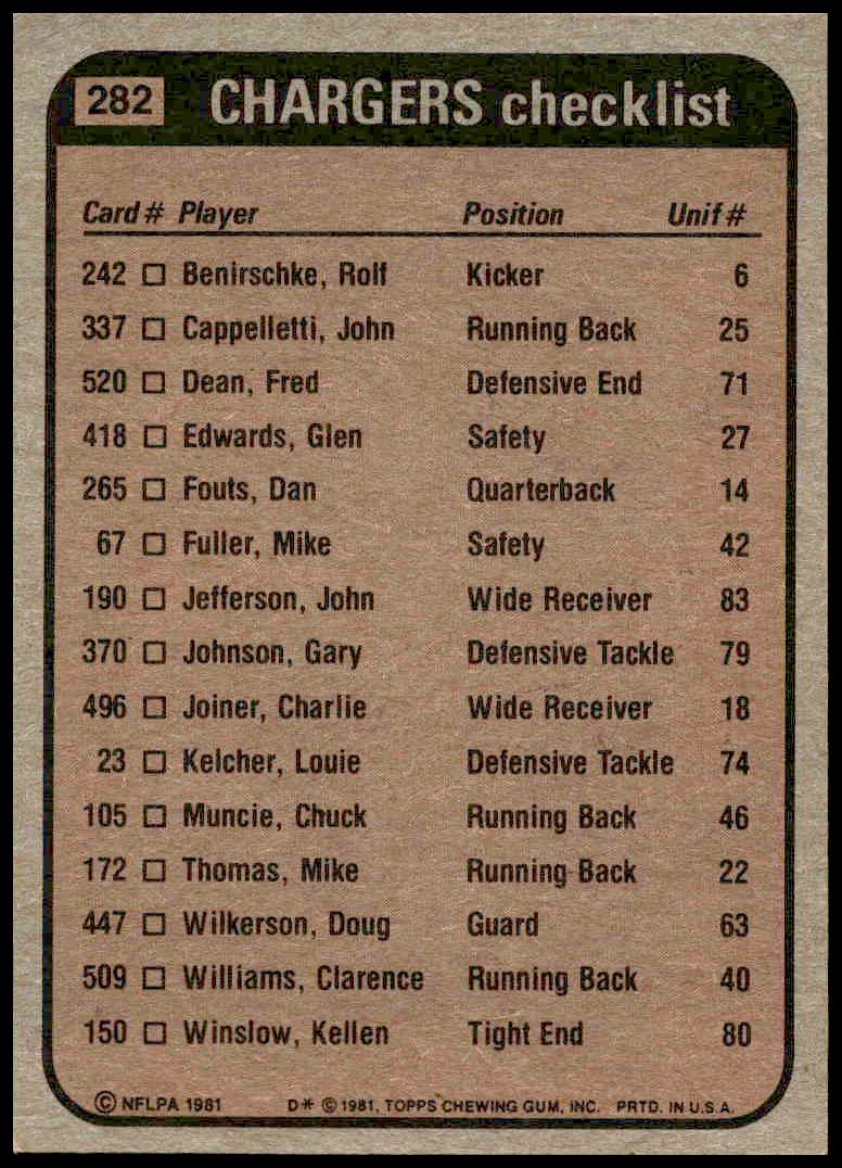1981 Topps Chargers Checklist #282