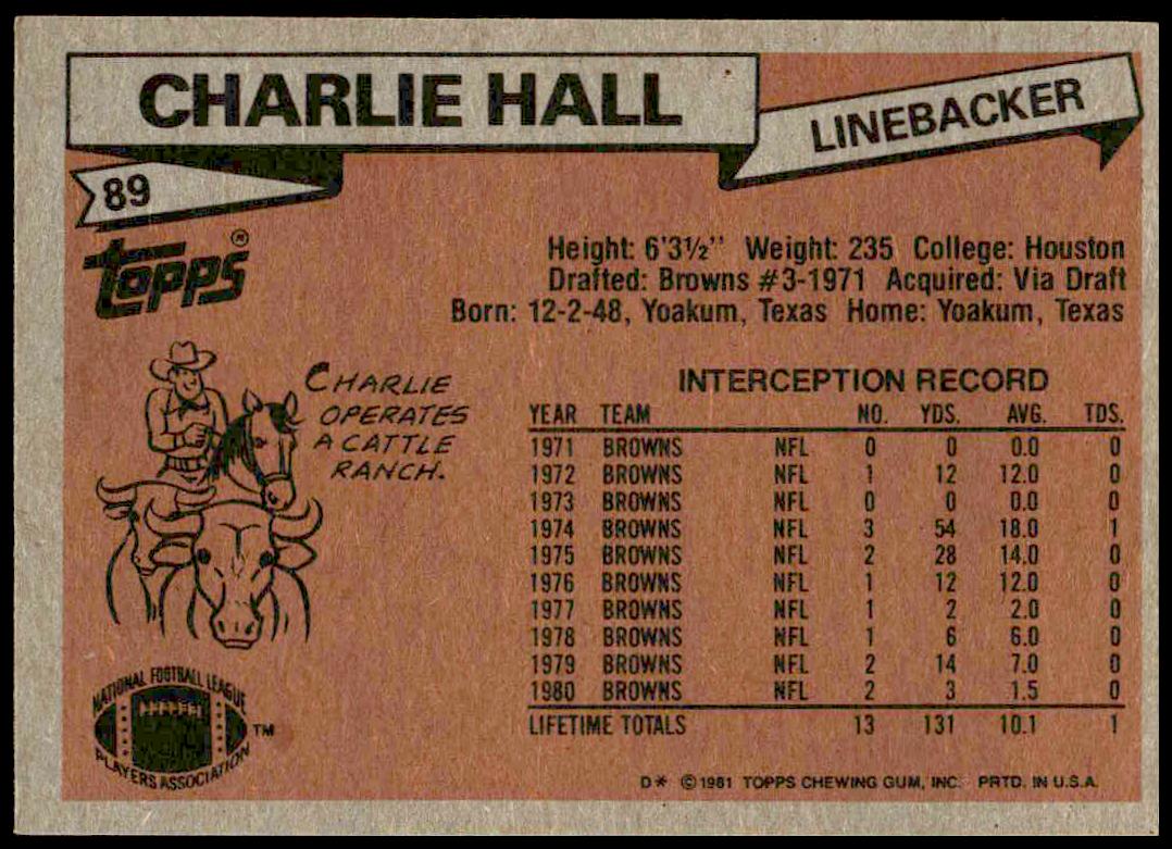 This Football card, from 1981 is part of the Topps  card set. Charlie Hall is featured and has a card number of 89.
